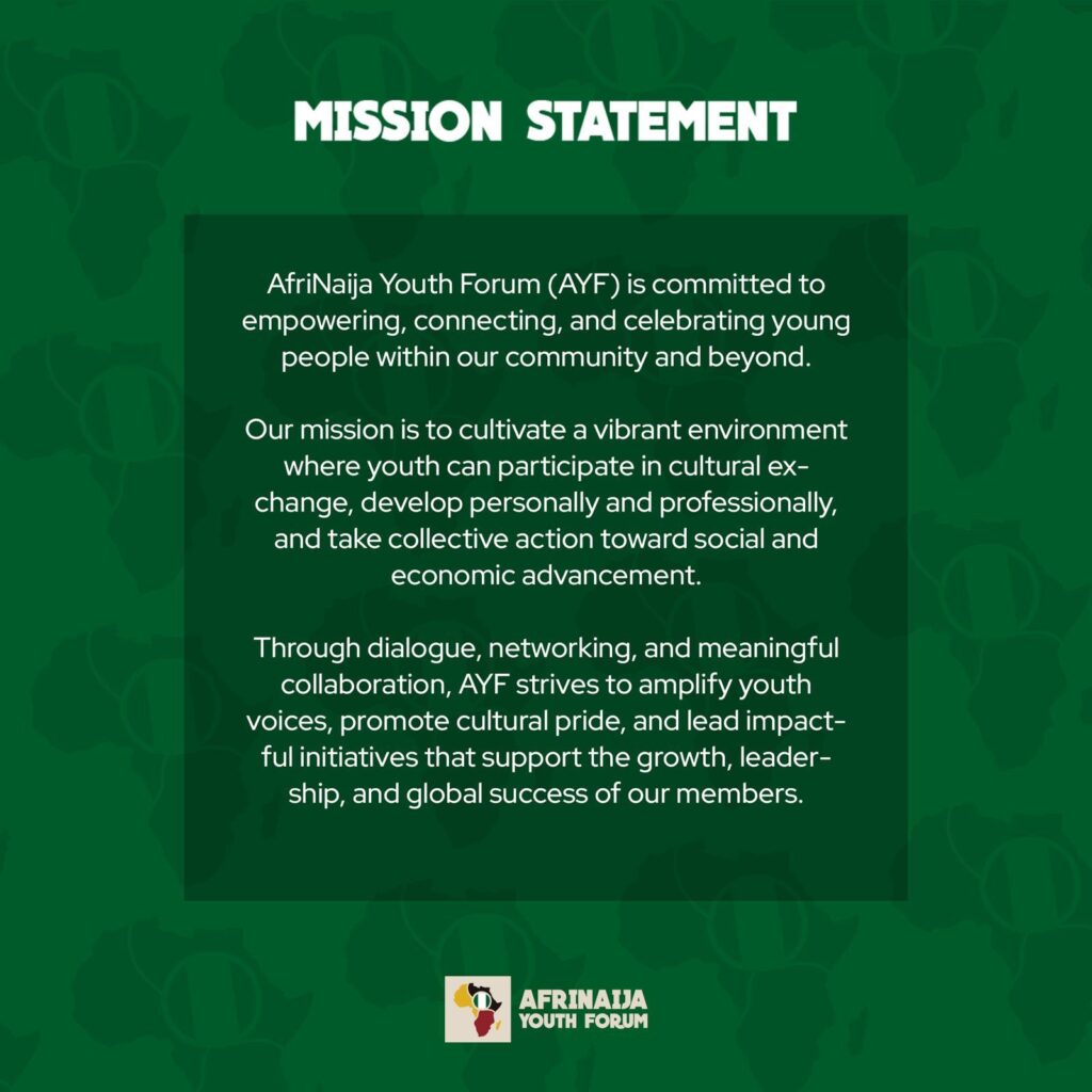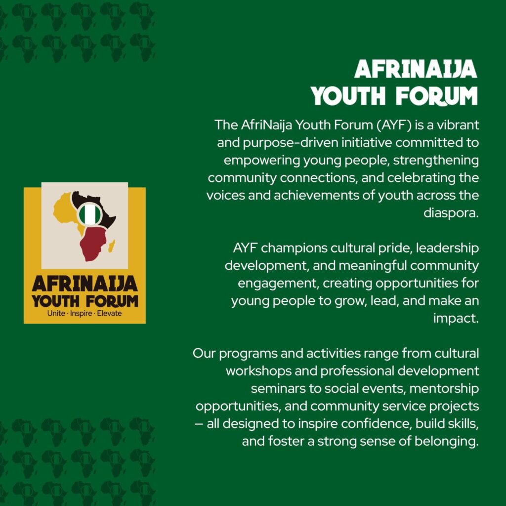 AfriNaija Youth Forum (AYF) is a vibrant community initiative dedicated to empowering, connecting, and celebrating young individuals particularly young Africans in the Diaspora. Anyone who identifies with our mission of promoting cultural pride, leadership development, and community engagement is welcome to join.
